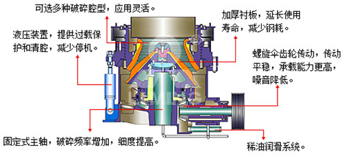 液壓圓錐破碎機采用固定主軸、小球面軸互等的優(yōu)化結構,比彈簧圓錐破的效率高5%-15%。破碎沖程、破碎速度和破碎腔型的完美結合,比彈簧圓錐破的產(chǎn)量高35%-60%。