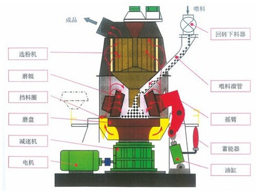 立磨工作時(shí),主電機通過(guò)減速機帶動(dòng)磨盤(pán)轉動(dòng),同時(shí)熱風(fēng)從進(jìn)風(fēng)口進(jìn)入立磨機體內,物料從下料口落在磨盤(pán)中央,在離心力的作用下,物料從磨盤(pán)中央向邊緣均勻移動(dòng),經(jīng)過(guò)磨盤(pán)上的粉磨輥道區域時(shí),受到磨輥的碾壓,大塊物料直接被壓碎,細粒物料受擠壓后形成料床進(jìn)行粒間粉碎。被粉碎的物料繼續向磨盤(pán)邊緣移動(dòng),直到被風(fēng)環(huán)處的強氣流帶走,而較大的顆粒物料又重新掉落到磨盤(pán)上繼續粉碎,氣流中的物料經(jīng)過(guò)上部的分離器時(shí),在轉子葉片的作用下,粗顆粒重新回到磨盤(pán)上粉磨,合格的細粉隨氣流一起出磨,被系統的集粉器收集,被收集到的粉料即為立磨磨出的產(chǎn)品?;烊胛锪系蔫F塊等雜物隨物料運動(dòng)到磨盤(pán)邊緣時(shí),由于自身重量大而不能被風(fēng)吹起,跌落至磨機下腔被安裝在磨盤(pán)底部的刮料板刮入排渣口排出機外。