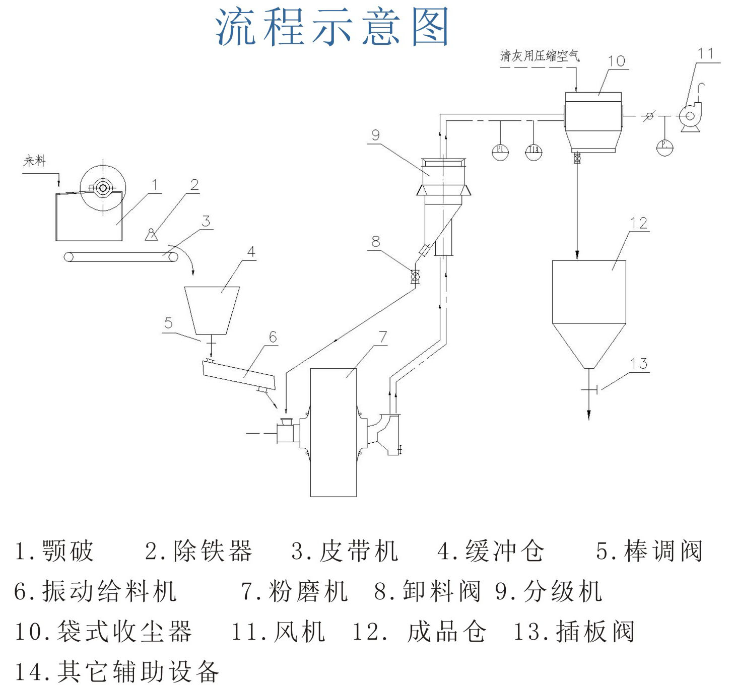步驟3. 滿(mǎn)足粒度要求的合格物料隨風(fēng)進(jìn)入袋式收塵器進(jìn)行收集,其余粒度的物料在分級機的離心力的作用下返回粉磨機繼續進(jìn)行重新粉磨;