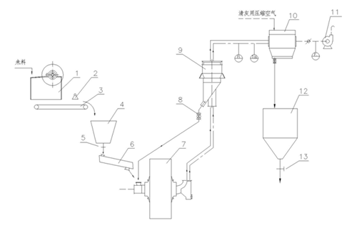 1.顎破 2.除鐵器 3.分級機 4.緩沖倉 5.棒調閥 6.振動(dòng)給料機 7.粉磨機 8.卸料閥 10.袋式收塵器 11.風(fēng)機 12. 成品倉 13.插板閥 14.其它輔助設備