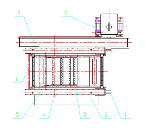 1、彈簧支承 2、齒輪箱 3、從動(dòng)輥 4、主動(dòng)輥 5、機架6、聯(lián)動(dòng)裝置7、箱體8、電機