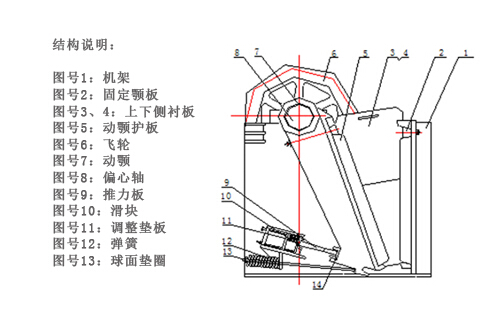 1. 一是固定顎板(定顎),垂直(或上端略外傾)固定在機體前壁上,另一是活動(dòng)顎板(動(dòng)顎),位置傾斜,與固定顎板形成上大下小的破碎腔(工作腔)。