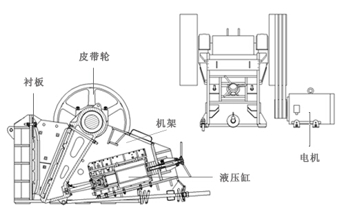 2. 電動(dòng)機通過(guò)皮帶輪,帶動(dòng);偏心輪轉動(dòng),從而帶動(dòng)動(dòng)顎做復擺運動(dòng),破碎物料。