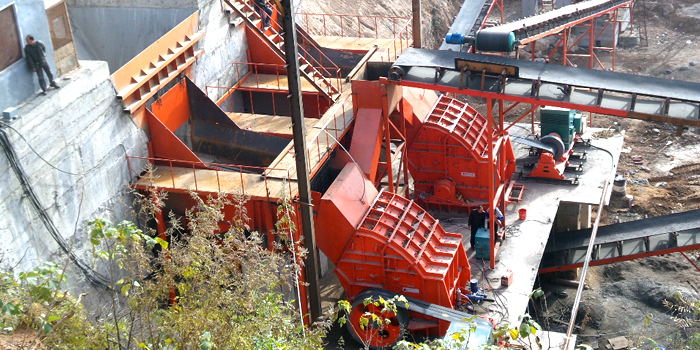 大塊石料經(jīng)料倉由振動(dòng)給料機均勻地送進(jìn)顎式破碎機進(jìn)行粗碎,粗碎后的石料由膠帶輸送機送到反擊式破碎機進(jìn)行進(jìn)一步破碎;細碎后的石料由膠帶輸送機送進(jìn)振動(dòng)篩進(jìn)行篩分,篩分出幾種不同規格的石子,滿(mǎn)足粒度要求的石子由成品膠帶輸送機送往成品料堆;不滿(mǎn)足粒度要求的石子由膠帶輸送機返料送到反擊式破碎機進(jìn)行再次破碎,形成閉路多次循環(huán)。